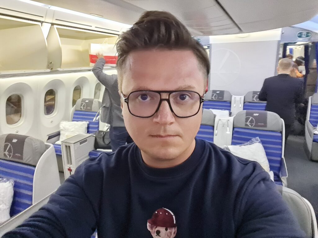 Żelaznymi punktami klasy biznes w PLL LOT jest na pewno wygodny szeroki fotel rozkładający się do pozycji łóżka i menu. Jeżeli chodzi o fotele to w dreamlinerach LOT-u fotele ułożone są w układzie 2-2-2. To rzadko spotykany dziś, przestarzały w klasach biznes układ foteli, który sprawia, że osoby zajmujące miejsca przy oknach, mogą zostać „uwięzione” przez obcego współpasażera, jeżeli np. zamiast pójść spać, będą chcieli oglądać filmy i korzystać z podniebnego baru. Tuż przed wyborami LOT jednak zapowiedział zmiany i wprowadzenie nowych foteli we wszystkich klasach do swoich samolotów, a układ foteli w klasie biznes za parę lat zmieni się na 1-2-1. Ponieważ podczas mojej podróży wybrałem fotel w środkowym rzędzie (a więc z dostępem do korytarza), mogłem przez całą kilkugodzinną podróż bez skrępowania opuszczać i zajmować swoje miejsce.