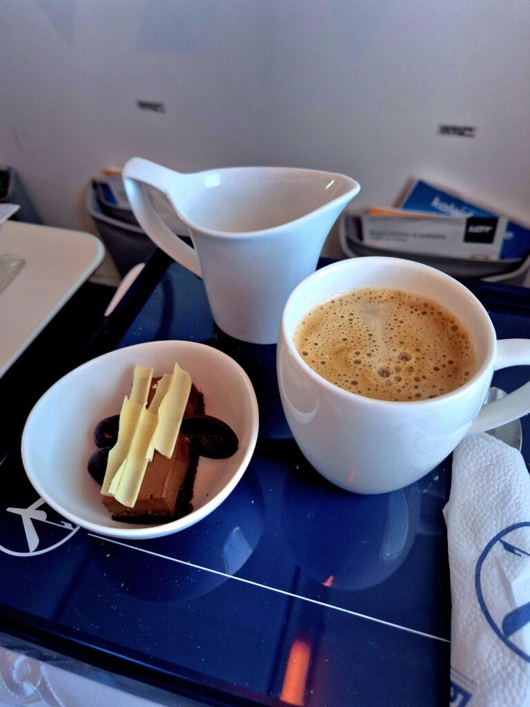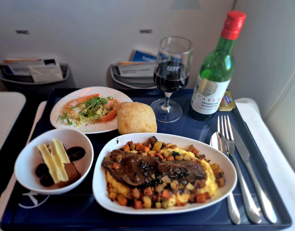 Po znów „plastikowym” welcome drinku, starcie i wyłączeniu sygnalizacji „zapiąć pasy” rozpoczął się popołudniowy serwis. W przypadku napojów był adekwatny do tego na pierwszym odcinku, jeżeli chodzi o jedzenie było zdecydowanie lepiej. W menu na przystawkę zaserwowano krewetki z sałatką z selera, na danie główne do wyboru – policzki wołowe z polentą z kaszy i pieczonymi ziemniakami oraz tartę czekoladowo-wiśniową na deser. Potrawy były smaczne, a wybrana przeze mnie wołowina naprawdę niezła.