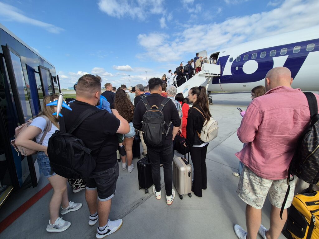 Kupując bilet w klasie biznes kolejny przywilej przewoźnik oferuje nam podczas boardingu, czyli wejścia na pokład samolotu. O ile maszyna jest podpięta do tzw. rękawa, i można od razu z terminalu przejść do środka, pasażerowie klasy biznes – mając priorytet – na pokład wchodzą jako pierwsi, bez tłumów mogąc zająć swoje miejsce. W przypadku mojego rejsu do Barcelony samolot czekał na odległym miejscu postojowym, dlatego przewoźnik zapewnił „podwózkę” lotniskowym autobusem. Tu klasa biznes nie istnieje, więc niezależnie od kwoty zapłaconej za bilet, czeka nas podróż w zatłoczonym pojeździe, nie ma też mowy o pierwszeństwie wejścia na pokład, bo nikt nad tym nie panuje. Tu LOT ma zdecydowanie nad czym popracować. Pamiętam, że ponad dekadę temu LOT dla pasażerów klasy biznes i premium oferował naziemny transfer małymi busami.
