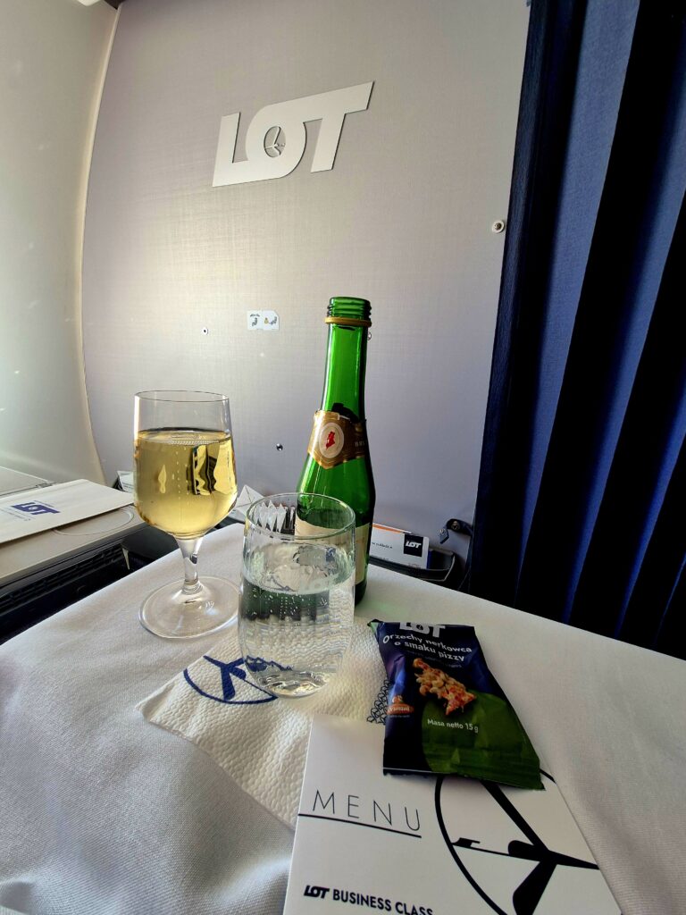 Na pokładzie, jeszcze przed startem pasażerom oferowany jest sok lub woda. Niestety w plastikowych kubkach, choć tu również LOT parę lat temu welcome drinki serwował w szkle.