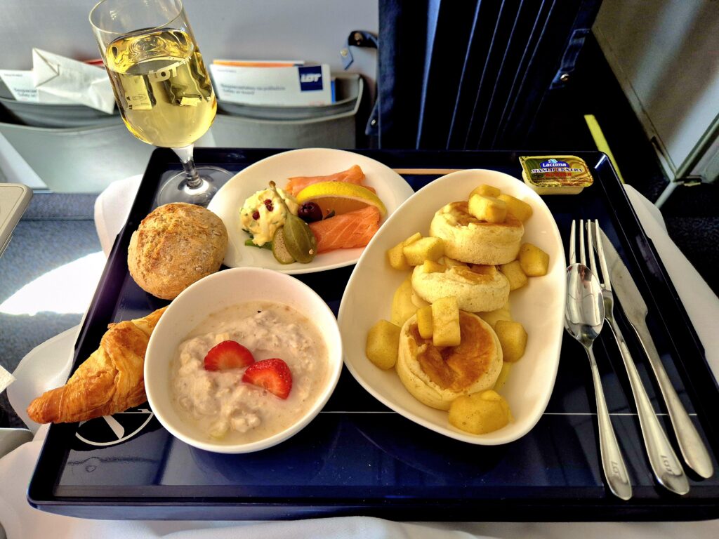 Wygląd dań zaserwowanych na porcelanie oceniam bardzo dobrze, gorzej z wielkością porcji i smakiem. Roladki z indyka zostały „zabite” przez nadmiar chrzanu (który lubię), musli nie było jadalne, a wybrane przeze mnie naleśniki okazały się ciasto-placuszkami bez smaku z dobrym sosem. W trakcie lotu obsługa wielokrotnie interesowała się pasażerami, zabierając brudne naczynia czy proponując kolejne napoje. To duży plus, ale nie zaskakujący, bo LOT ma bardzo sympatyczne i profesjonalne załogi.