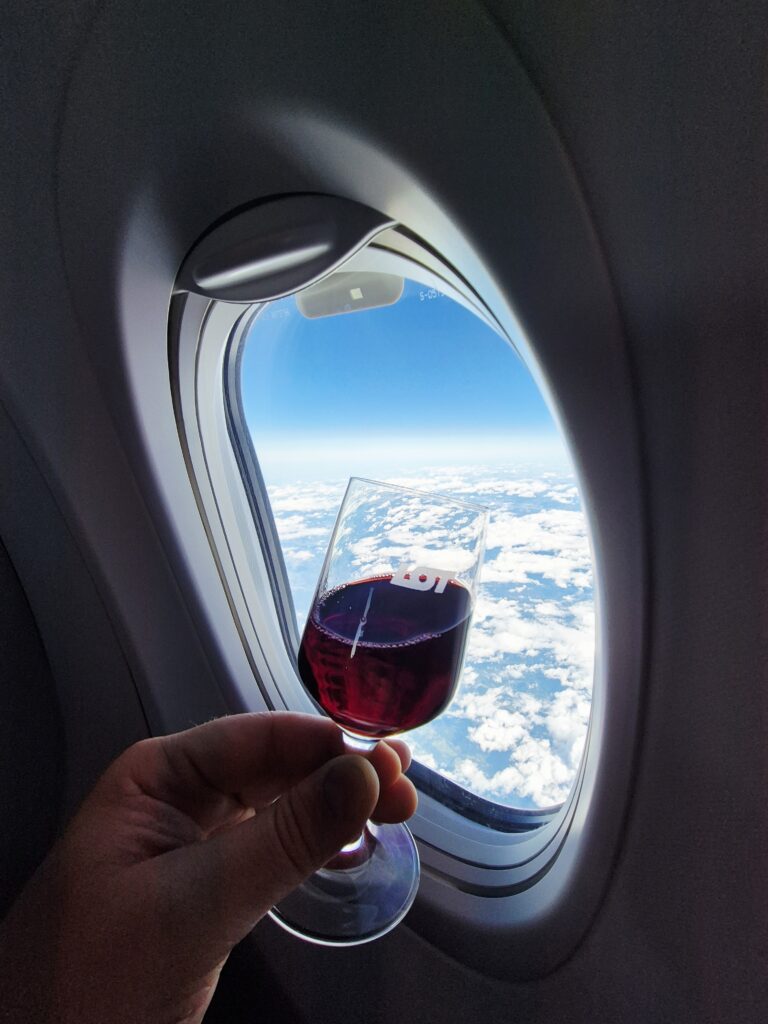 W ofercie na moim locie był wybór wina białego, czerwonego, francuskie wino musujące, wódka biała oraz smakowa, koniak, likier, whisky, gin i piwo, a także kolorowe napoje bezalkoholowe (m.in. Coca-Cola), soki owocowe, woda, a także kawa i herbata. Do tego obsługa zaproponowała pestki dyni w czekoladzie i orzechy nerkowca o smaku pizzy, a potem w trakcie lotu także nowego pokładowego wafelka (który zastąpił „Grześki”).